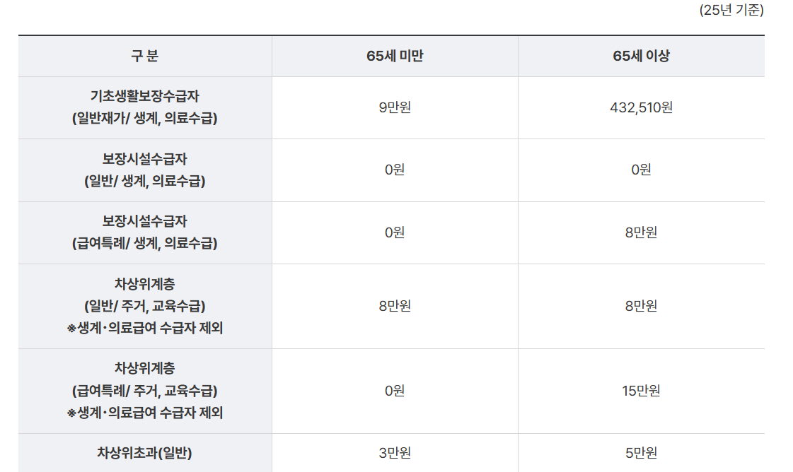 2025년 기준 단독가구의 최대 기초급여액은 월 32만 2000원이며, 부부가구일 경우 각 25만 7600원으로 차등 지급됩니다.