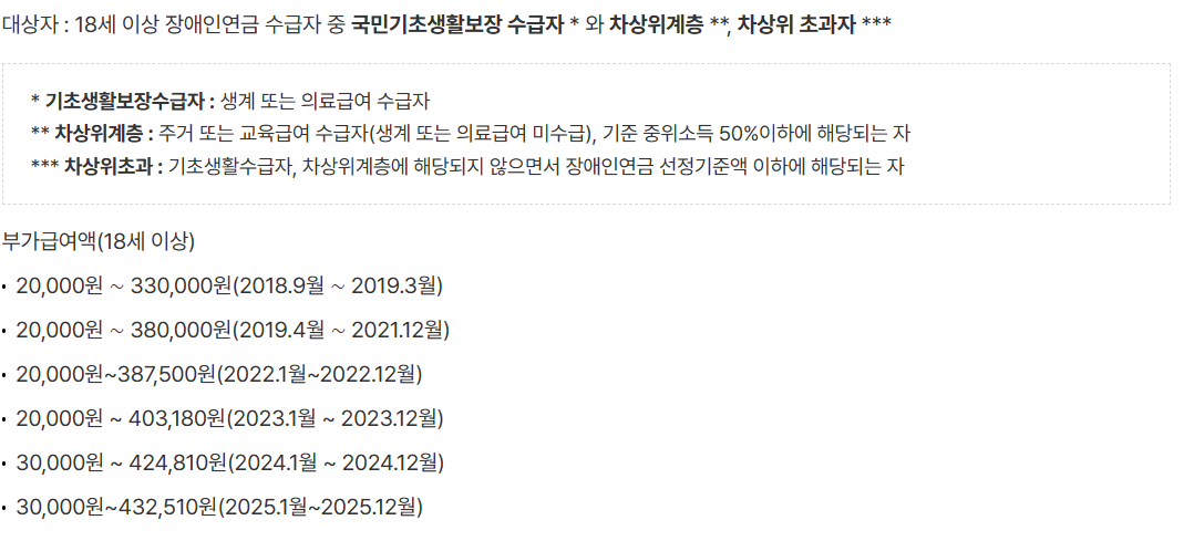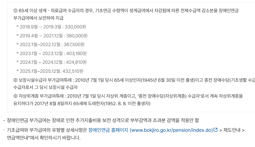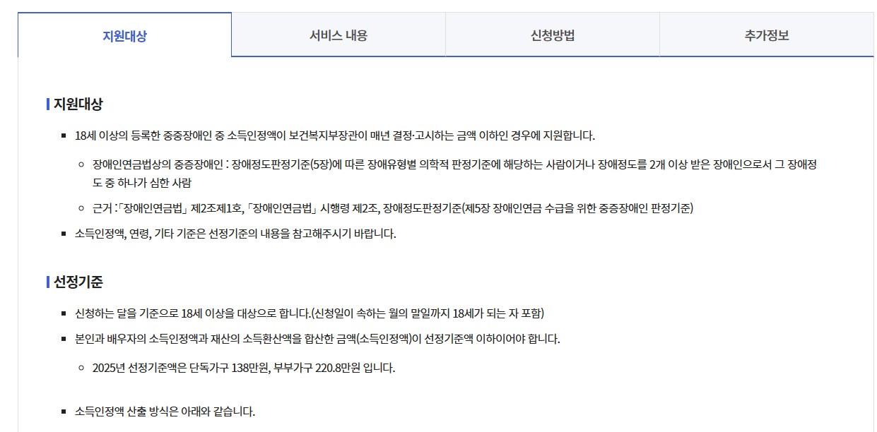 가구의 소득인정액이 ‘장애인 연금 선정기준액’ 이하인 경우에만 대상이 됩니다. 2025년 기준으로는 다음과 같은 선정기준액이 적용됩니다.