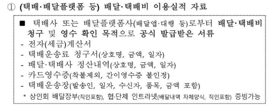 주요 배달앱을 통해 배달 서비스를 이용했거나 택배사를 통해 배송한 경우, 다음과 같은 서류를 제출하면 됩니다.