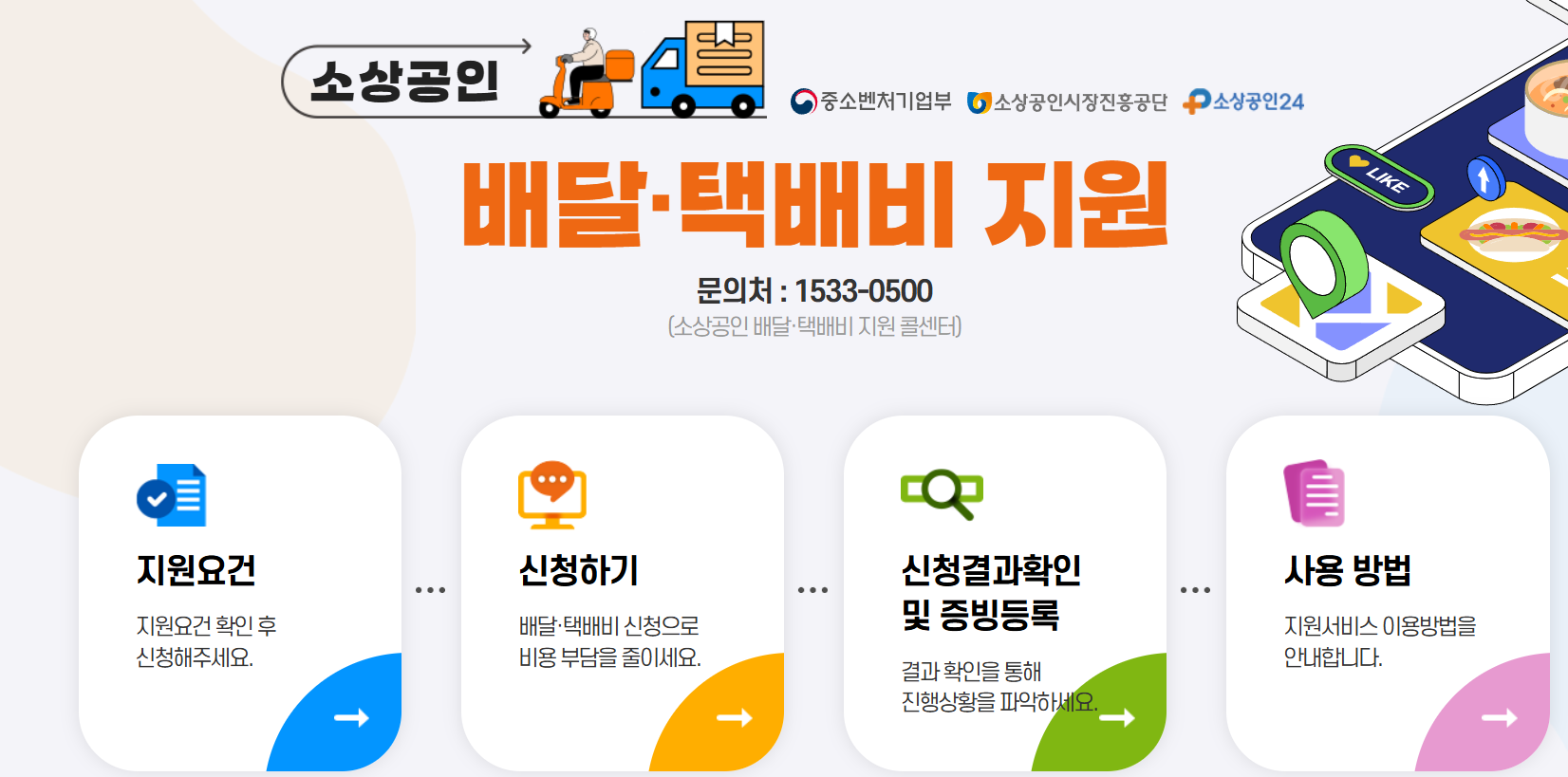 아울러 소상공인24 누리집(소상공인24 바로가기)을 통해서도 접속하여 신청할 수 있으며, 관련 문의는 소상공인 배달·택배비 지원 콜센터(☎ 1533-0500)를 통해 안내받을 수 있습니다.