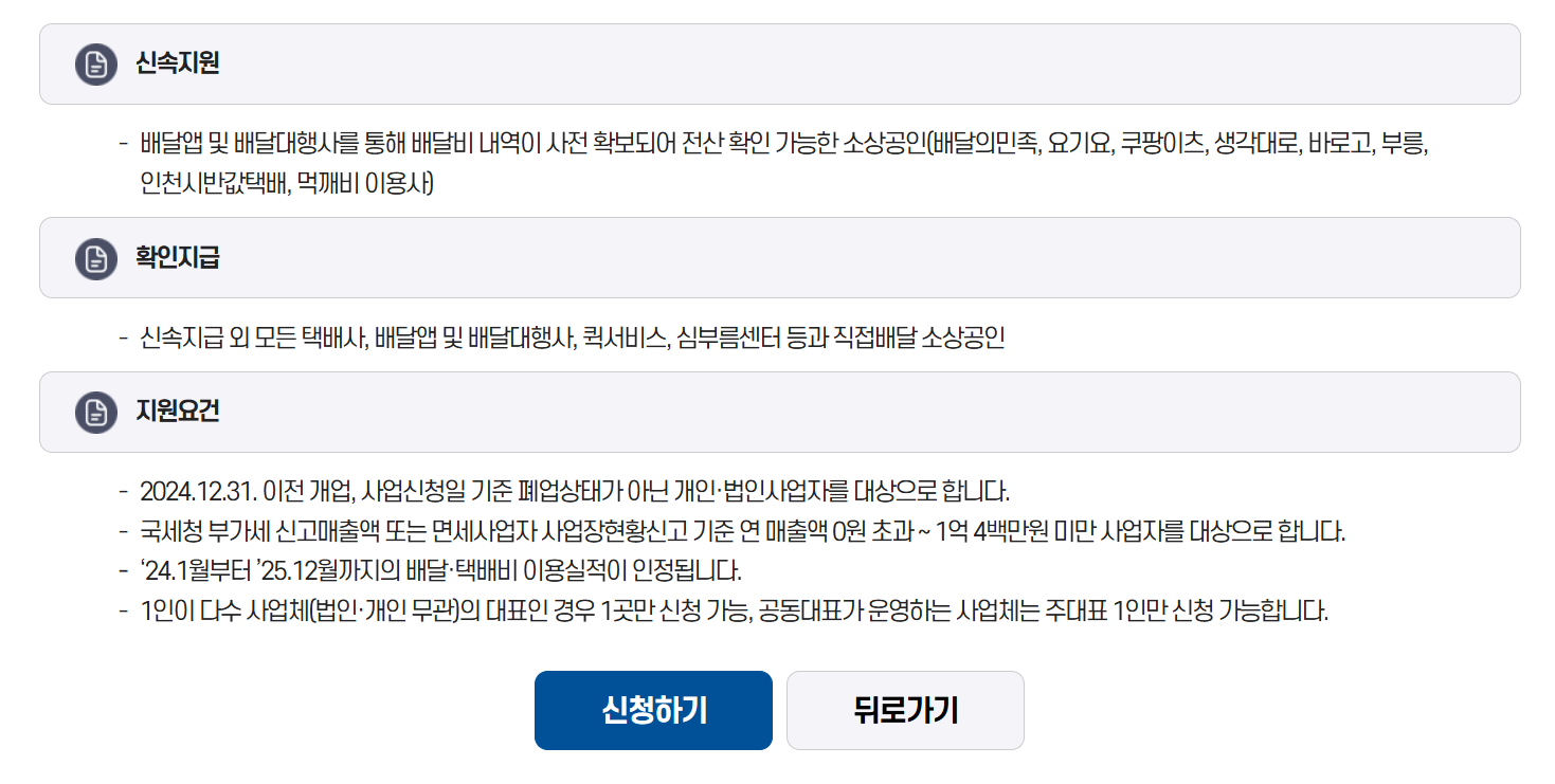 2023년 또는 2024년 연 매출액이 1억 400만 원 미만인 소상공인으로, 배달 또는 택배 실적이 있고 신청일 기준 폐업하지 않은 개인 또는 법인사업자여야 합니다. 특히 2024년 개업한 경우에는 월평균 매출을 기준으로 연 매출을 환산하여 지원 대상 여부를 판단하게 됩니다.