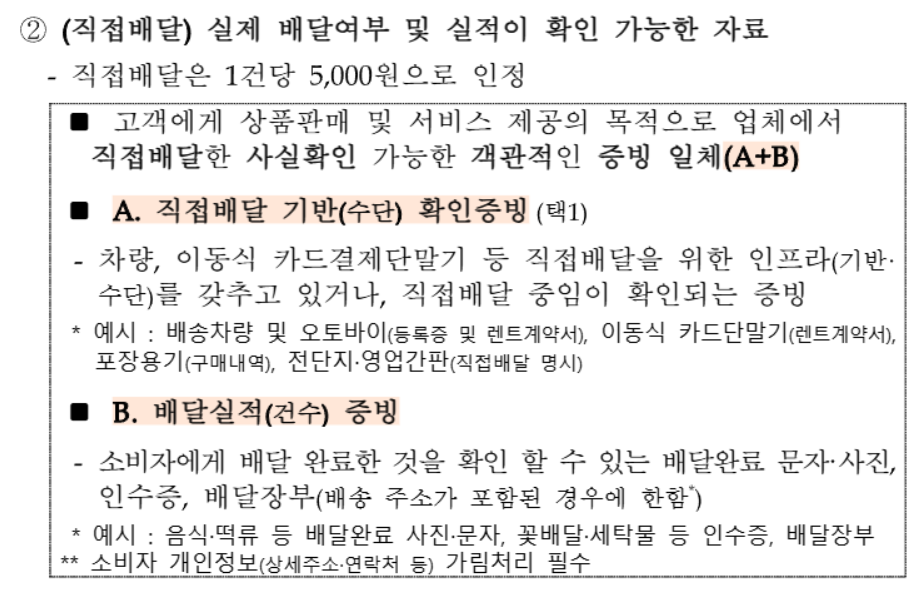 배달 인프라는 직접 배달을 한다는 것을 증명하는 최소한의 자료로 차량 등록증, 이동식 카드단말기 계약서, 포장 용기 구매내역서, 배달 문구가 표기된 간판 또는 전단지 중 하나를 선택하여 제출할 수 있습니다.