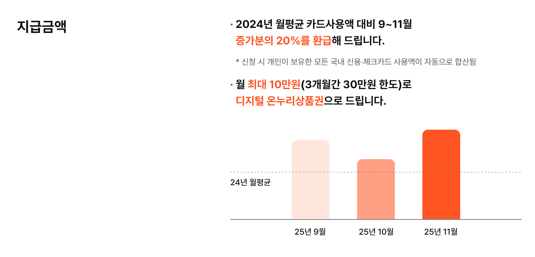 "2024년 월평균 카드소비액보다 2025년 9~11월까지 늘어난 월별 카드소비액의 20%를 디지털 온누리상품권으로 돌려주어 소비진작 및 소상공인을 지원하는 사업입니다."