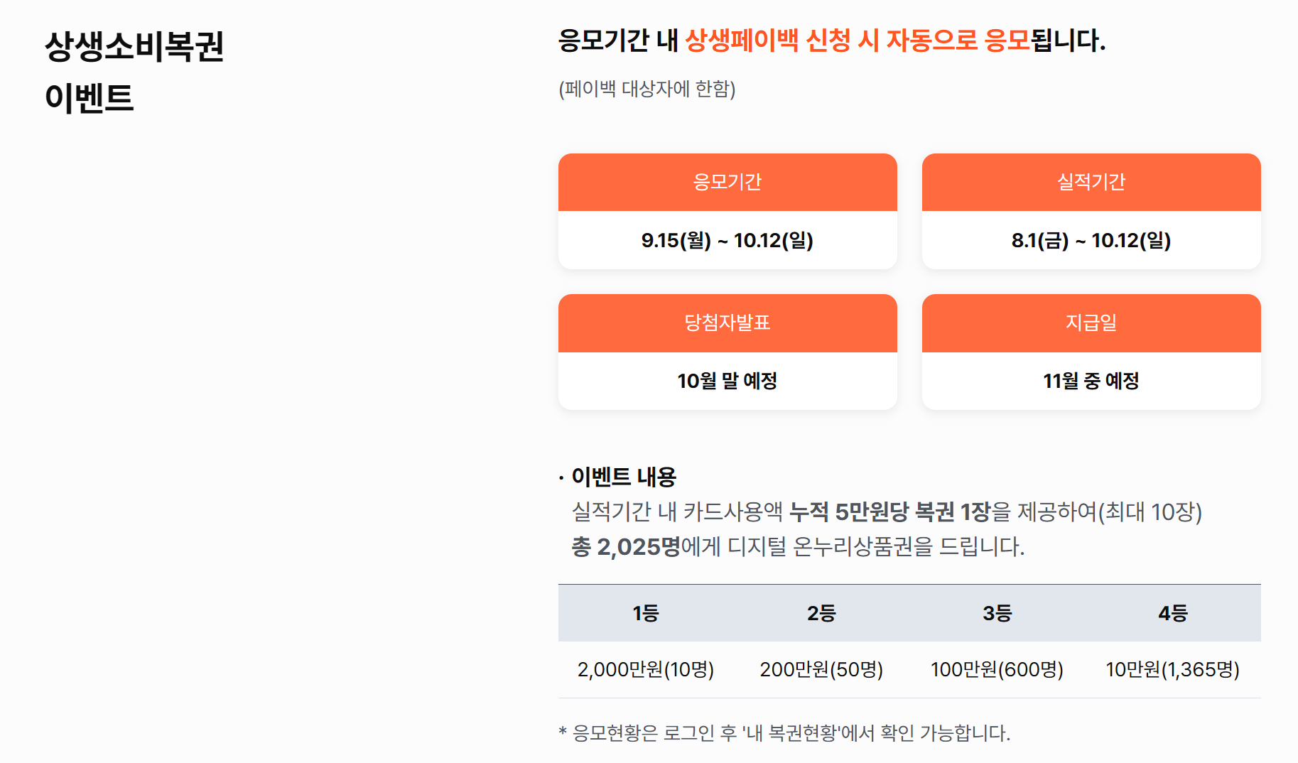 * 복권 실적 기간: 8월 1일 ~ 10월 12일 (이 기간의 카드 사용액 5만원당 복권 1장, 최대 10장) * 복권 응모 마감일: 10월 12일 (상생페이백 신청을 이날까지 완료해야 함) * 페이백 신청 최종 마감일: 11월 30일