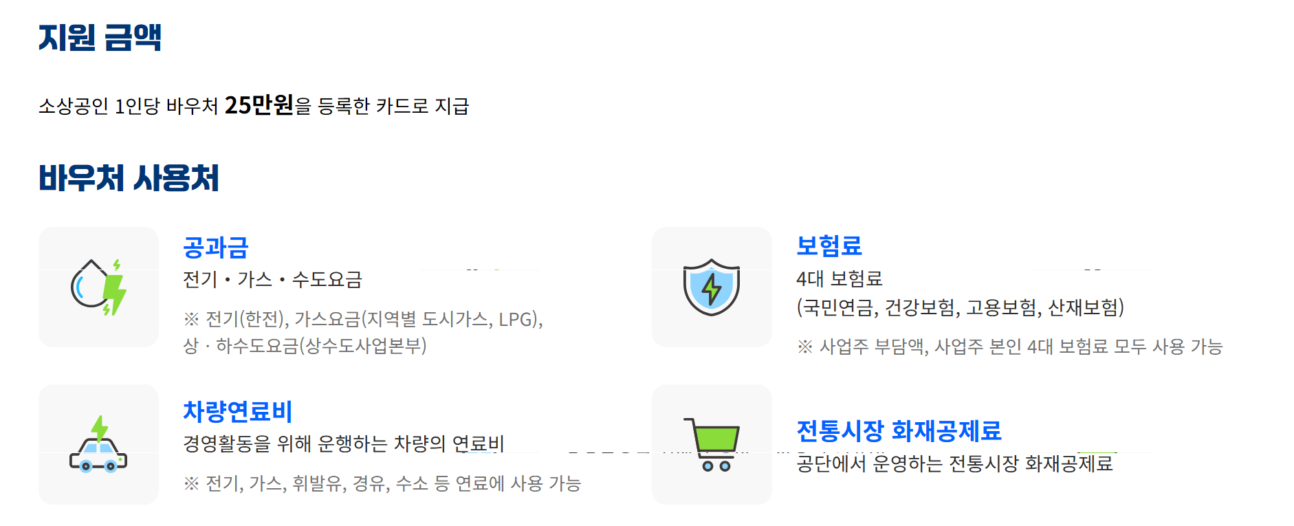 이 외에도 차량을 이용한 영업 활동이 잦은 소상공인을 위해 차량 연료비 결제에도 사용이 가능하며, 전통시장 화재공제료 납부에도 활용할 수 있습니다. 이는 전통시장 상인들의 안전과 지속적인 영업 환경을 고려한 항목으로 평가받고 있습니다.