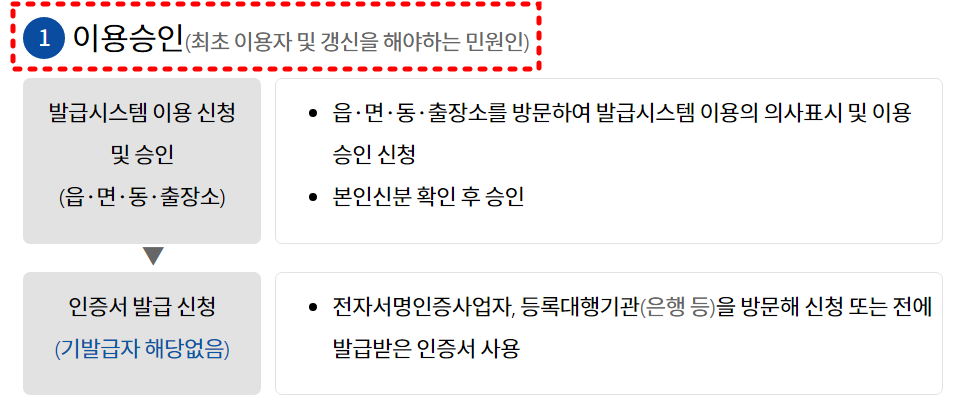 최초 이용자는 신청 및 발급시스템 이용을 위해 사전절차가 필요합니다. 최초 1회에 한해 본인이 행정복지센터 등에 방문해서 신분증 본인확인 후 이용승인을 받을 수 있습니다.