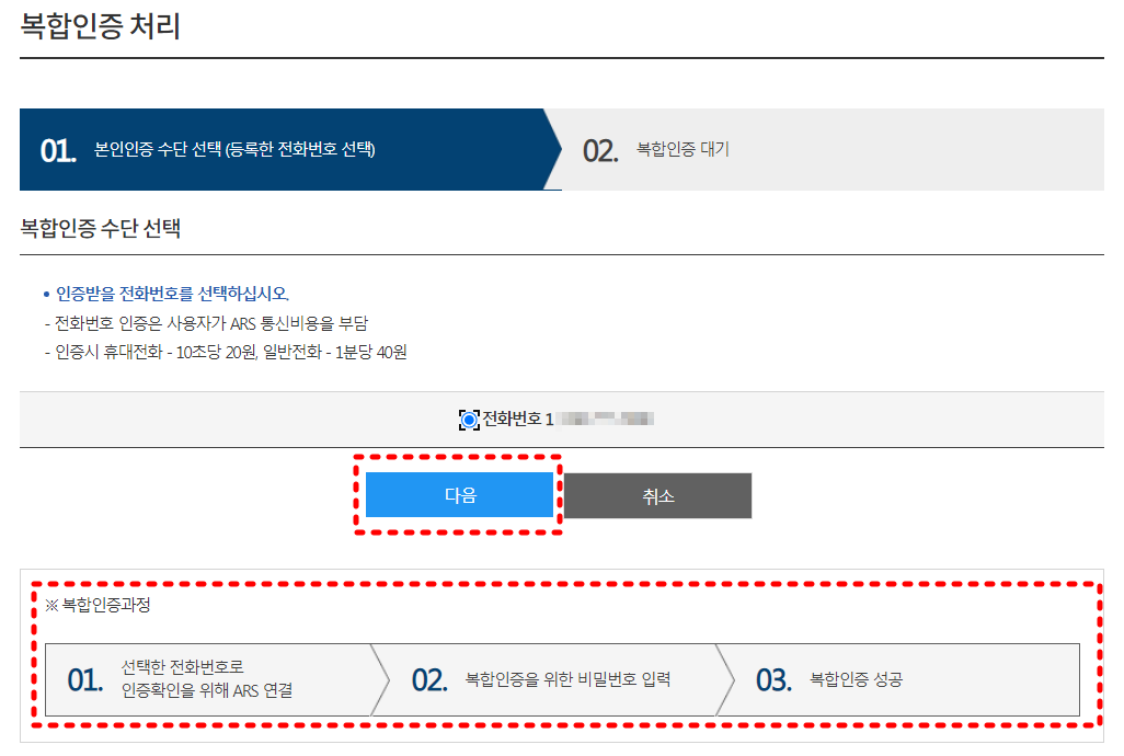 인증서 등록 및 '복합인증' 등록까지 완료된 분이라면 복합인증 절차를 진행하게 됩니다. 선택한 전화번호로 ARS확인 후 비밀번호 입력하면 완료입니다.