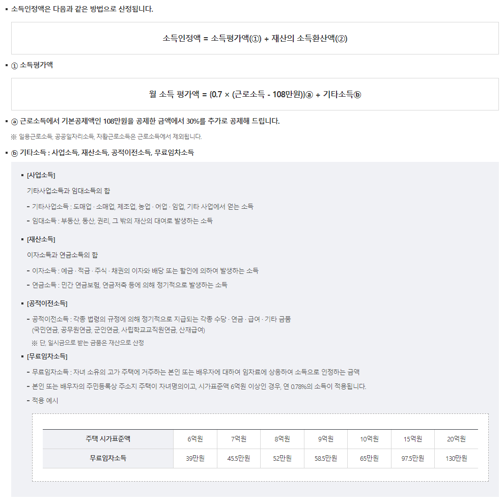 - 기타소득 (사업소득, 재산소득, 공적이전소득, 무료임차소득)을 더합니다.