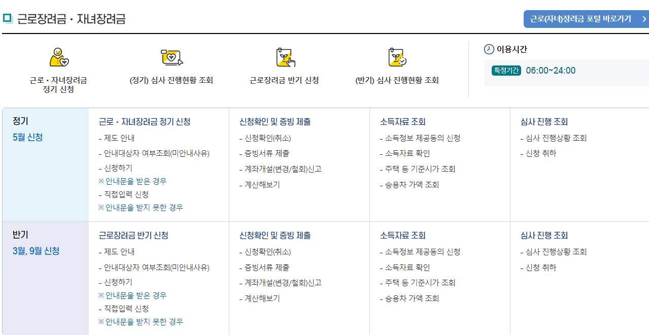 정기신청: 5월 1일부터 5월 31일까지 가능하며, 당해년도 전체 근로장려금을 한 번에 신청하는 방식입니다. 다만, 사업소득과 종교인소득 중 하나라도 있는 경우에는 반기신청이 불가능하며 정기신청 기간에만 신청할 수 있습니다.
