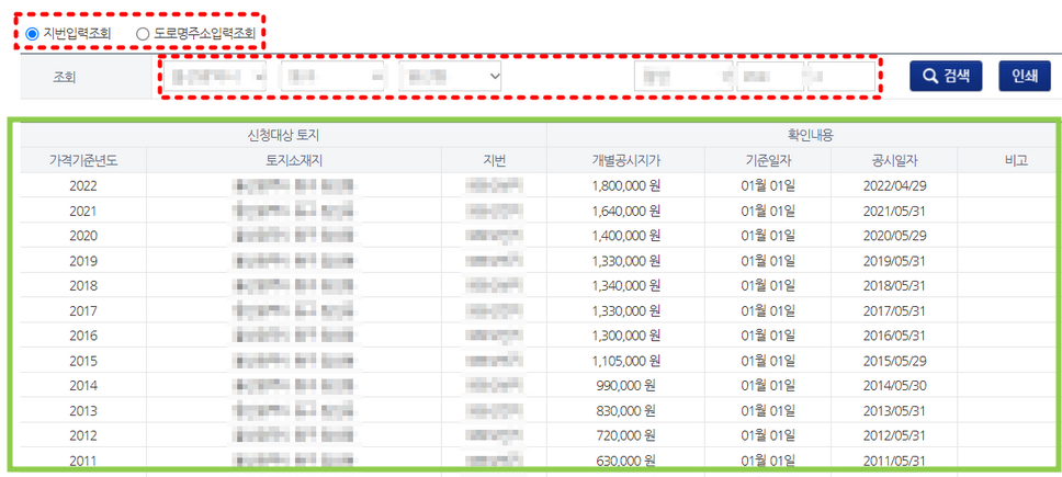 선택 후 지번으로 또는 도로명으로 해당 토지의 주소를 넣게 되면 일자별 개별공시지가가 나오게 됩니다.