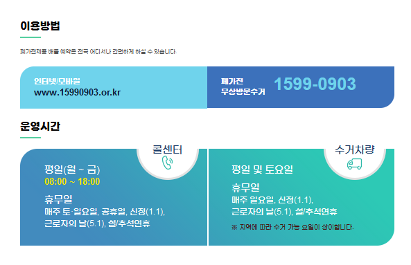 전화(1599-0903), 모바일(www.15990903.or.kr), 인터넷(www.15990903.or.kr), SNS(카카오톡 ID: 폐가전무상방문수거 또는 weec) 등을 통해 편리하게 예약할 수 있습니다.