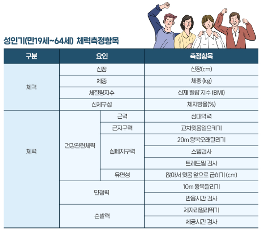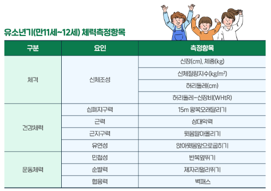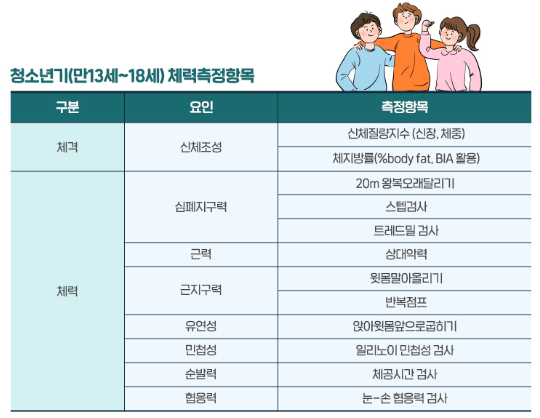 체력측정은 연령별로 유소년기, 청소년기, 성인기, 노인기로 구분되며 그 측정 항목이 비슷하지만 약간씩은 상이합니다. 청소년기와 성인기는 검사 항목 중 체공시간 검사가 있는 반면 노인기 분들에게는 없는 등의 방식입니다. 유소년기는 만 11세~12세, 청소년기는 만13세~18세, 성인기는 만19세~64세, 노인기는 만65세 이상으로 구분하고 있습니다. 제사한 측정항목은 아래 그림 및 홈페이지를 참고하시면 좋습니다.