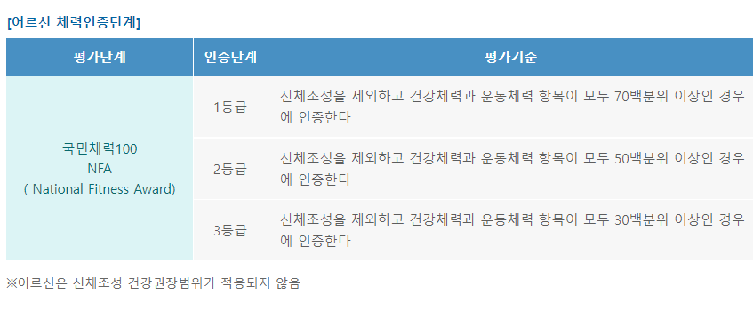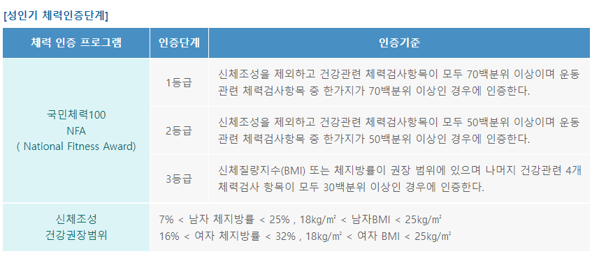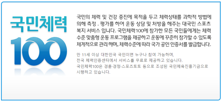 국가가 지정한 이러한 서비스 기관을 '국민체력100 체력인증센터' 라고 하며 전국에 76개소가 있습니다. 국민체력100 체력인증센터는 국가가 지정한 공인 인증기관으로서 체력측정, 체력평가 후 관련된 운동처방을 제공해주며 체력인증을 공식적으로 수행하고 있습니다.