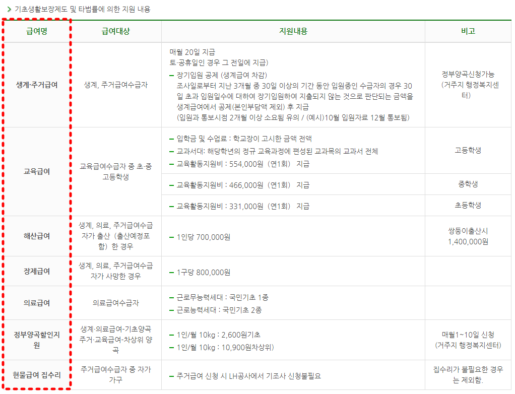 | 각 급여내용 상세 바로가기 (금액 및 자격) | |||