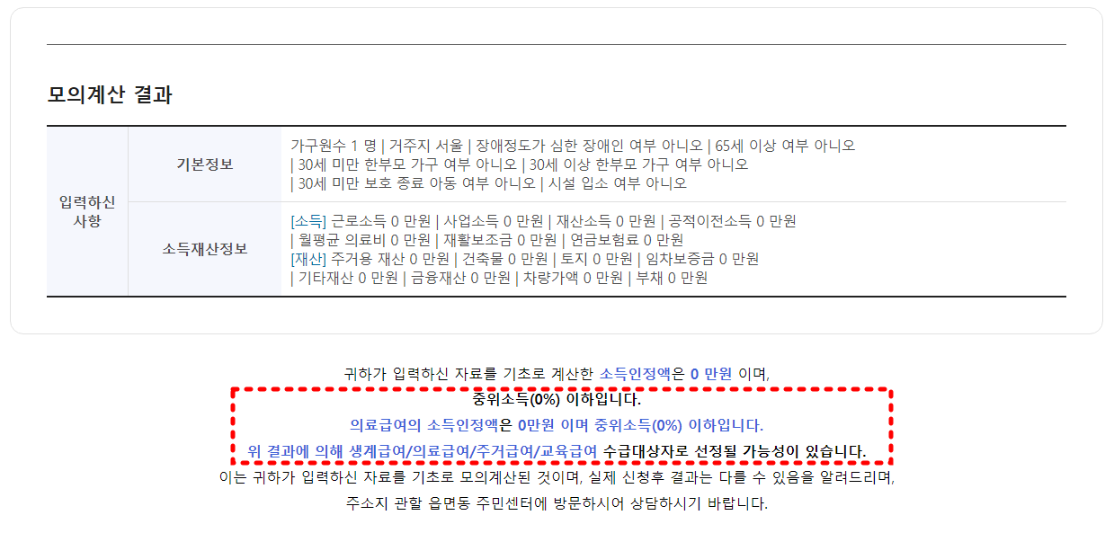 필요한 경우에는 실제로 모의계산을 통해 자격 여부를 확인할 수도 있습니다. 복지로 홈페이지 접속 후 '기초생활보장 모의계산' 메뉴를 이용합니다.