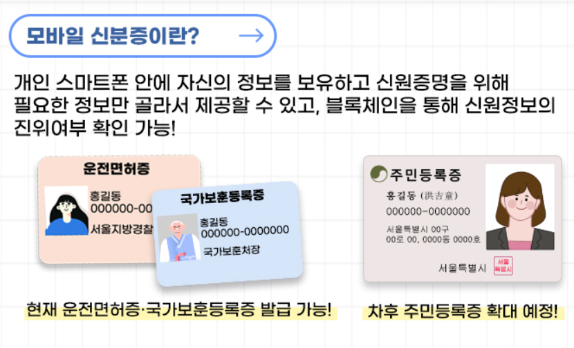 운전면허증이나 국가보훈등록증 같은 공식적인 신분증을 종이나 실물 형태로 갖고 다니지 않고도 스마트폰 하나로 간편하게 신분을 증명할 수 있어요.