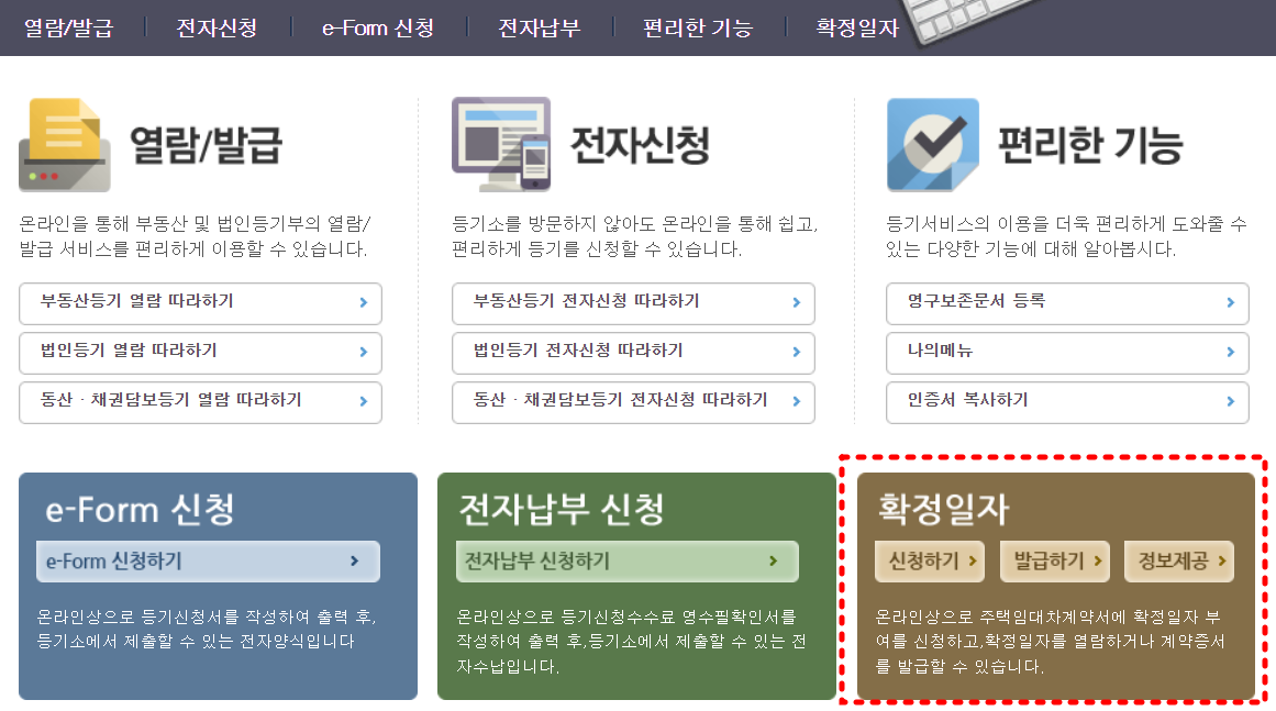 대한민국 인터넷 등기소에 접속하여 메뉴 중 '확정일자' 에서 '신청하기'를 누르면 본인인증 후 확정일자 신청가능하니 온라인으로 편리하게 신청하세요.