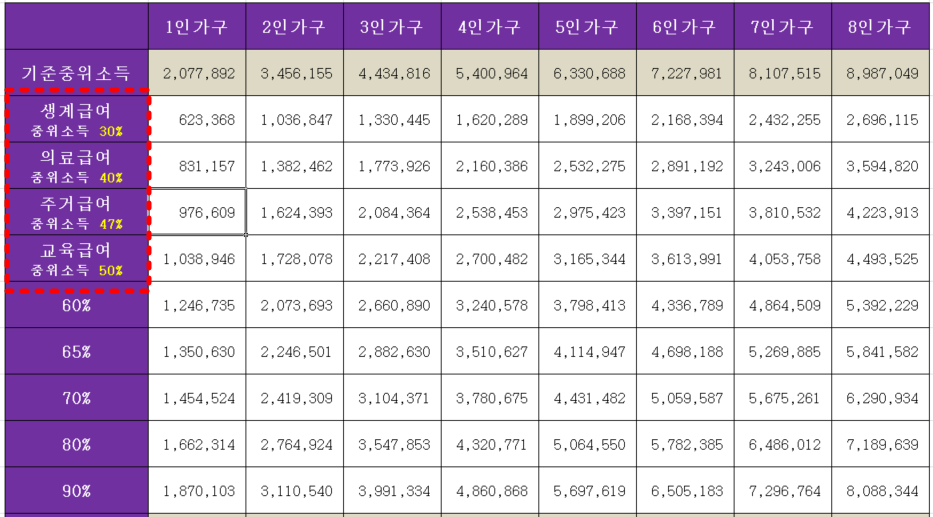 중위소득이란 대한민국 전체 가구 소득의 중간값인데요, 매 년 그 금액기준이 바뀌게 됩니다.
