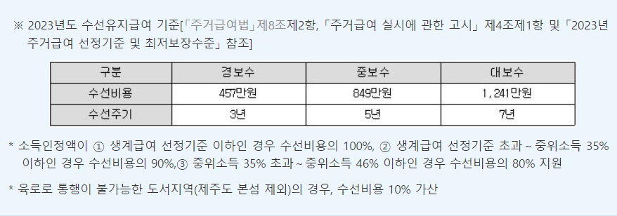 또한 주거하는 곳에 대한 수선비용(수리비용)도 지원하며 경보수/중보수/대보수로 구분하여 지원합니다.