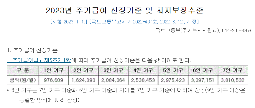 주거급여 선정기준 금액은 1인가구는 976,609원 ~ 7인가구는 3,810,532원이며 8인 이상부터는 직전 가구 금액 차이를 더하여 계산합니다.