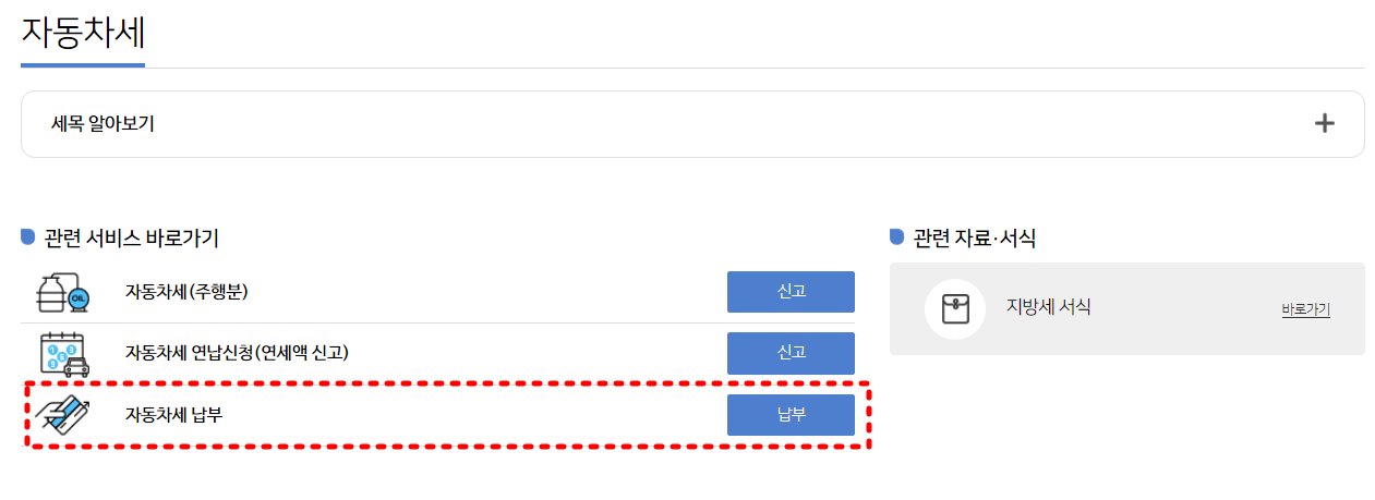 '자동차세 납부'에 있는 파란 '납부' 버튼을 눌러줍니다. 로그인 후 납부가 가능합니다.