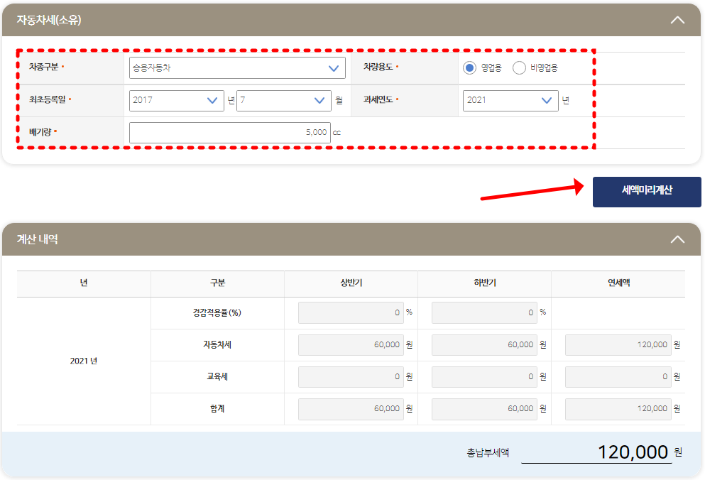 차종, 차량용도, 등록일, 과세연도, 배기량을 입력하고 '세액계산'을 누르면 총 납부세액을 확인할 수 있습니다.