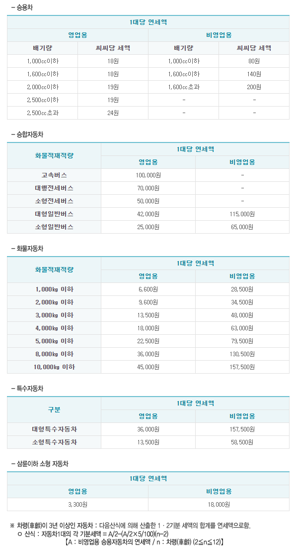 - 납세금액: 자동차의 배기량 및 승차정원, 적재정량에 따라 부과