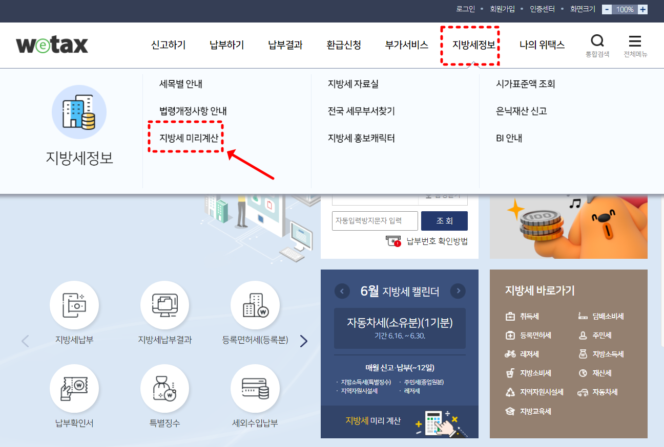 위택스 홈페이지 접속 후 상단 메뉴에서 '지방세정보' → '지방세 미리계산'을 눌러주세요.