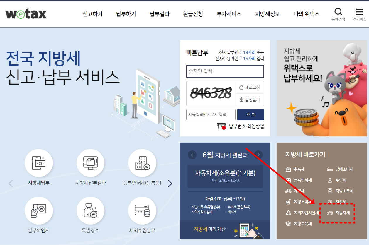 자동차세는 지방세이므로 지방세를 조회/납부하는 사이트인 '위택스'에서 자동차세의 조회와 납부가 모두 가능합니다.