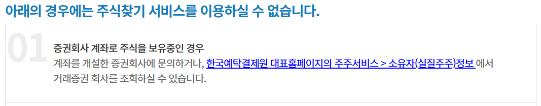 증권사를 통해 계좌를 개설하고 주식을 보유하고 있는 경우, 본 서비스는 이용할 수 없습니다. 이 경우에는 증권사에 직접 문의하거나 한국예탁결제원 대표 홈페이지에서 해당 주식의 증권사를 확인할 수 있습니다.