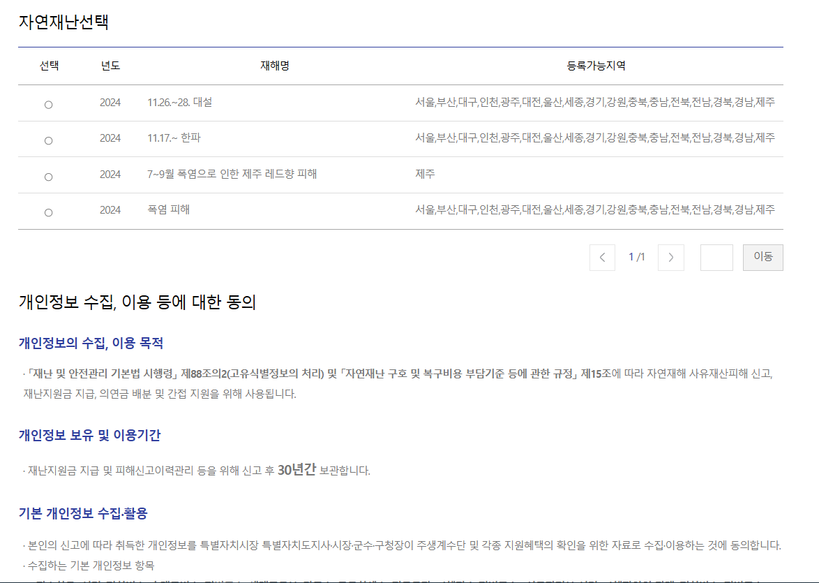 - 자연재난 선택: 해당 재난의 종류(태풍, 한파 등)와 발생 시기 선택.