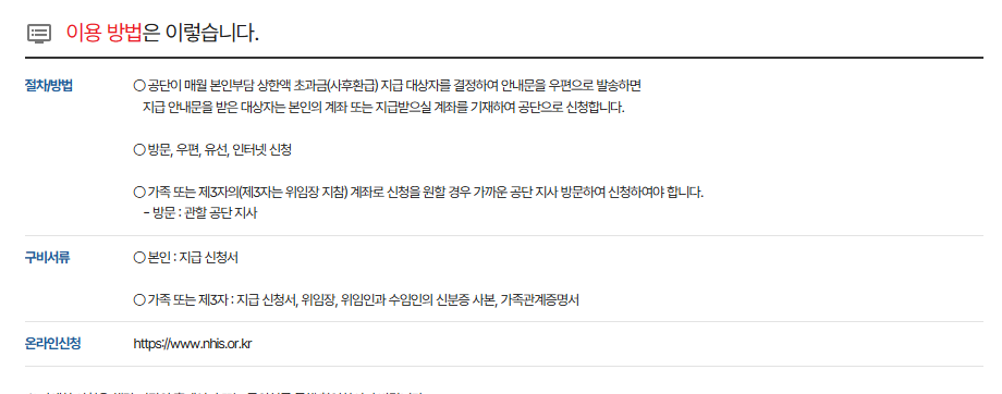 국민건강공단에 방문하여 사망 환자의 환급 대상 여부 확인 상속인임을 증명하는 서류와 함께 신청서 제출 심사 후 환급금 지급