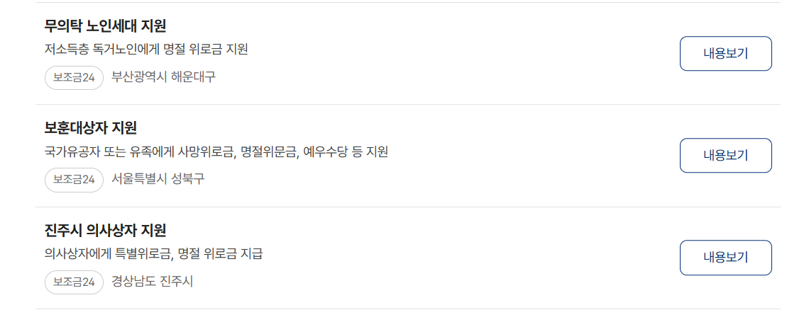 정부24에서 "명절 위로금"을 검색하면 거주 지역의 지급 대상 및 신청 정보를 확인할 수 있습니다.