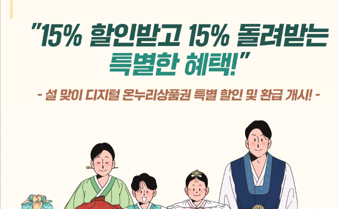 이번 설 명절을 맞아 디지털 온누리상품권의 기본 할인율이 기존 10%에서 15%로 상향됩니다.