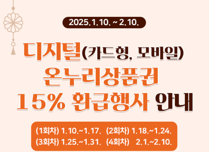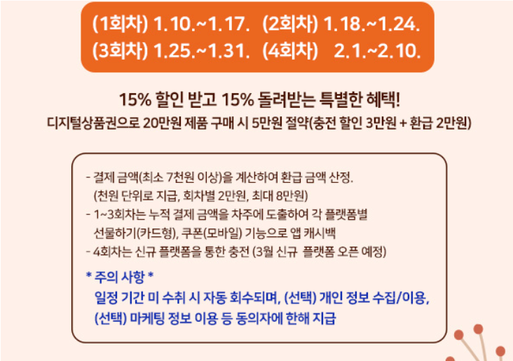 디지털상품권으로 결제한 금액의 최대 15%를 환급해주는 혜택도 마련되었습니다. 환급은 총 4회에 걸쳐 진행되며, 1인당 회차별로 최대 2만 원 한도로 환급받을 수 있습니다.